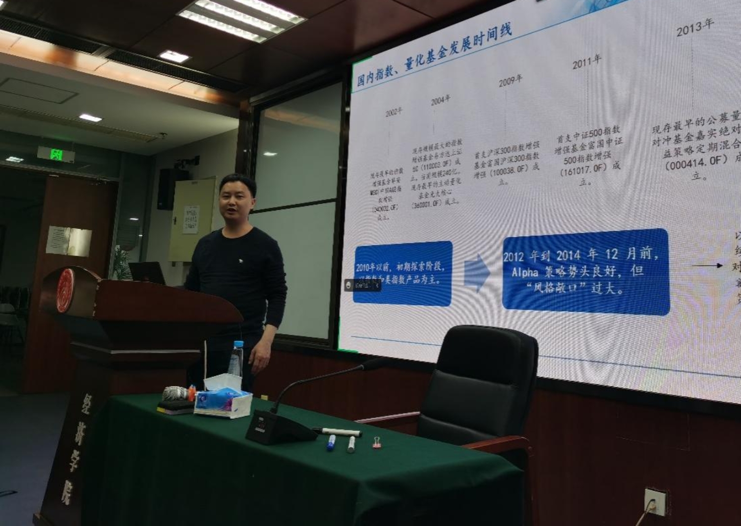 讲座开始前,北大金融工程实验室黎新平老师介绍了本次讲座的主题并热情欢迎了主讲嘉宾林晓明先生。林晓明先生首先介绍了自己在量化投资和金融工程领域的从业经历,然后在国内量化行业的发展历程、国内量化行业的现状及投资的量化以及Beta研究三个方面上进行展开介绍与分析。