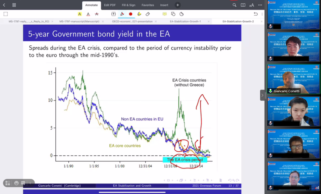 在提问环节,安卡罗·柯赛蒂教授详细回答了关于欧元区和非欧元区国家在应对疫情方面的差异性等问题,并与听众就疫情下的欧元区经济等相关问题进行了详细探讨。