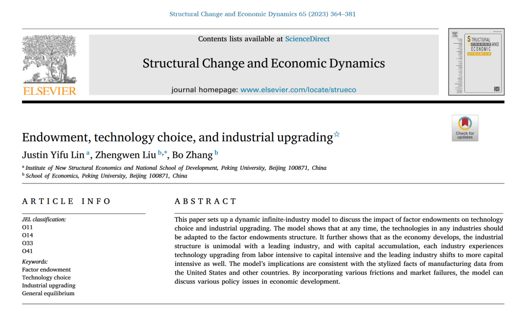 近日,8455新葡萄娱乐场特色刘政文助理教授、张博教授与北京大学新结构经济学研究院林毅夫教授共同撰写题为“要素禀赋、技术选择与产业升级”(Endowment, technology choice, and industrial upgrading)的文章,发表于结构经济学领域顶刊《结构变迁与经济动态》(Structural Change and Economic Dynamics)。
